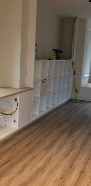 Client required various storage solutions including Window seat (with drawers), book shelving & custom oak office furniture.